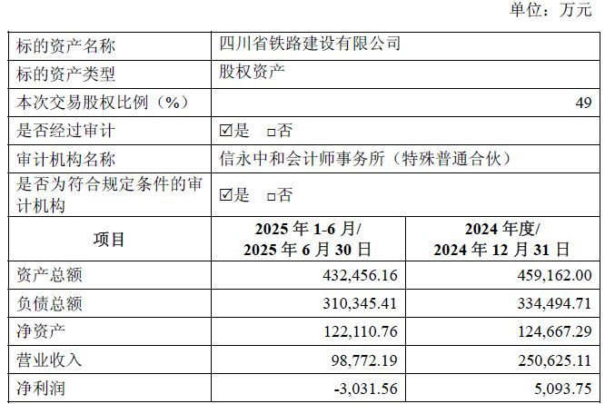 据四川路桥清晰的想法公司经审计的财务信息,四川铁建2024年杀青营收约25.06亿元、杀青净利润5093.75万元;2025年上半年杀青营收约9.88亿元、杀青净利润-3031.56万元。