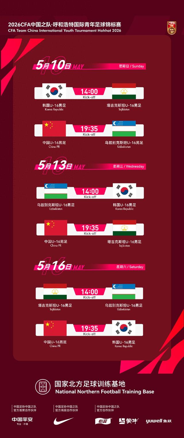 4月1日晚,中国足协官宣,2026CFA中国之队·呼和浩特外洋后生足球锦标赛将于5月10日至16日在呼和浩特朔方足球历练基地开赛。