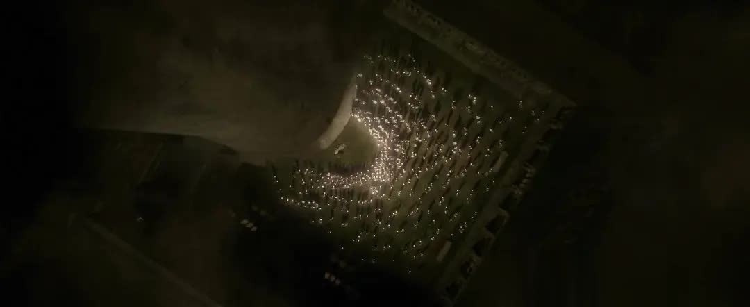 画面转为从太空向下俯视,仿佛去往天国路上的邓布利多在回望他最爱的霍格沃兹。而在他尚未冷却的躯体周围,星星落落的魔杖渐次点亮,照亮了尖尖塔顶上黑云密布的苍穹。