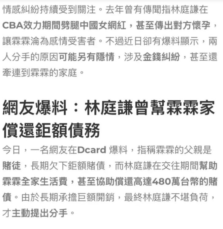 真相却是林庭谦并非被迫堕入神色纠纷,而是长久被前女友裹带压榨,恋爱期间他不仅全额承担李芷霖全家的生活费,还帮其父亲偿还了480万台币的赌债。