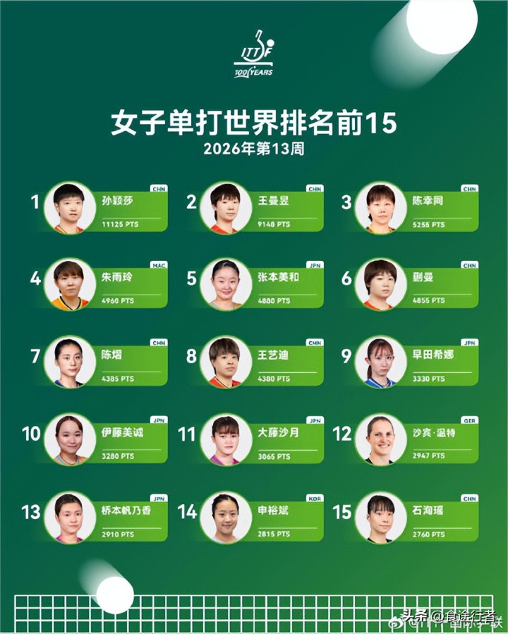 再看女片面,国乒径直承包了半壁山河,险些霸气到没一又友!孙颖莎、王曼昱、陈幸同,径直包揽了前三,变成了“国乒三巨头”的形态,蒯曼排第6,陈熠第7,王艺迪第8,前八名里,国乒就占了6个,这份总揽力,谁看了不震憾?尤其是孙颖莎,太历害了,积分破万不说,还相连超150周霸榜,八个有用积分,全是海外赛事的冠军,创下了新积分体系下的“全冠记载”,“女乒一姐”的位置,稳得不可再稳了!