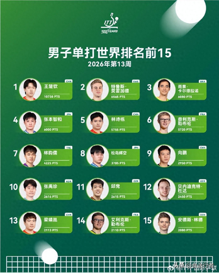 先说说男片面,国乒的强势,真实无谓多夸。王楚钦稳稳守着宇宙第一的宝座,积分径直破万,比第二名整整卓著4660分,这差距,说是“断层式领跑”皆不为过,妥妥的乒坛王者,气场径直拉满。不光他,林诗栋和向鹏也很过劲,诀别排第五和第九,前十榜单里,国乒一下子就占了3个限额,这份实力,不平皆不行。